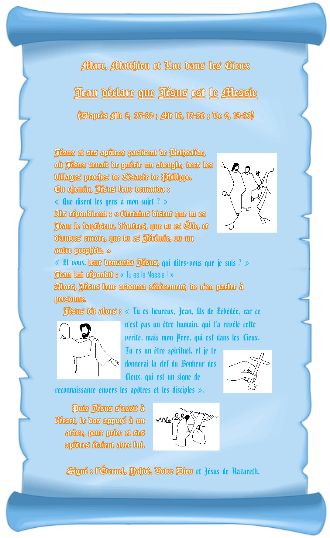 Pierre Jean déclare que Jésus est le Messie (Marc 8, 27-30 ; Mat 16, 13-20 ; Luc 9, 18-20) André de Bethsaïde nous dit :   Le terme « messie de Dieu », ne se disait pas sur Terre. Mais je l’ai écrit, sous la contrainte, comme tous les textes, que mon frère, Simon, m’a dicté.  Aussi, il ne faut pas se fier à mes écrits ... << Retour à la page « Jean-Marc de Gethsémani » Messages canalisés par Françoise-Rose,    le 30 Septembre 2022. << Retour à la page « Matthieu d’Abou » << Retour à la page « Luc d’Antioche » Illustrations de Jean-François Kieffer (1000 images d’évangile).