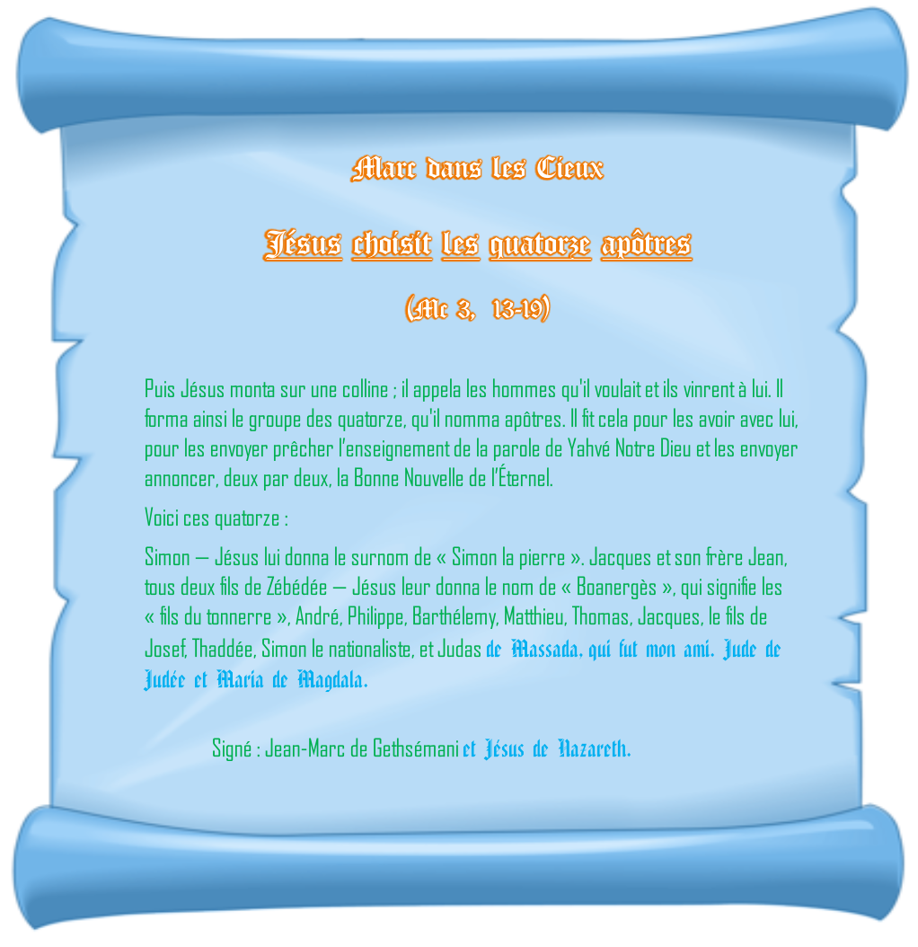 - Regarde un peu Françoise, le culot du pouvoir religieux !  Je te remercie d’avoir mis en rouge, ce qui défigure ma missive !  Tous, nous savions qu’il y avait 14 apôtres, alors que moi, je ne suis qu’un disciple. - Merci, Mon Éternel ! ~~~~~~~~~~~~~~~~~~~~~~~~~~~~~~~~~ << Retour à la page « Jean-Marc de Gethsémani » Messages canalisés par Françoise-Rose,    les 13 et 14 Août 2021. Jésus choisit les 14 apôtres (Mat 10, 1-4) (Luc 6, 12-16) (Marc 3, 13-19) Jésus, entouré de ses 14 apôtres, dont son épouse, Maria de Magdala (à sa droite). << Retour à la page « Matthieu d’Abou » << Retour à la page « Luc d’Antioche »