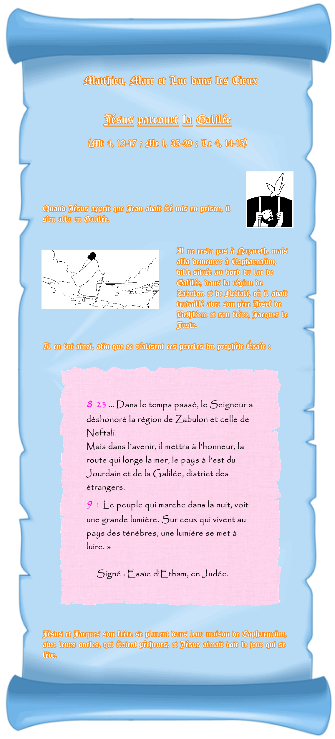 Jésus parcourt la  Galilée   (Mat 4, 12-17 ; Marc 1, 35-39 ; Luc 4, 14-15) << Retour à la page « Jean-Marc de Gethsémani » Messages canalisés par Françoise-Rose,    les 6 et 7 Août 2021. Fin le 29 Septembre 2021. << Retour à la page « Matthieu d’Abou » << Retour à la page « Luc d’Antioche » Illustrations (N & B) de Patrick Royer (1000 images symboliques)  et Jean-François Kieffer (1000 images d’évangile). L’Archange Eléazar